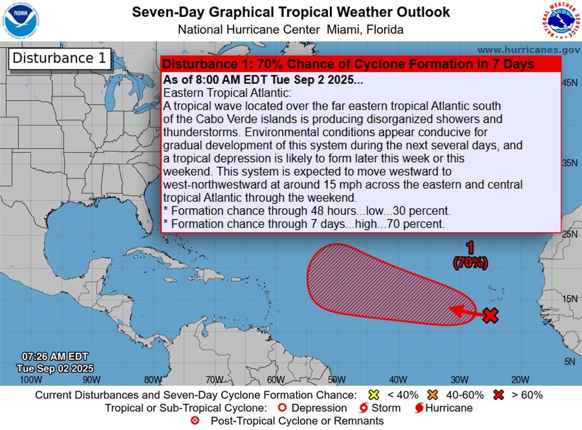 Atlantic tropics - The National Hurricane Center flags a tropical wave with a moderate to high chance of development this week; track remains far east for now.