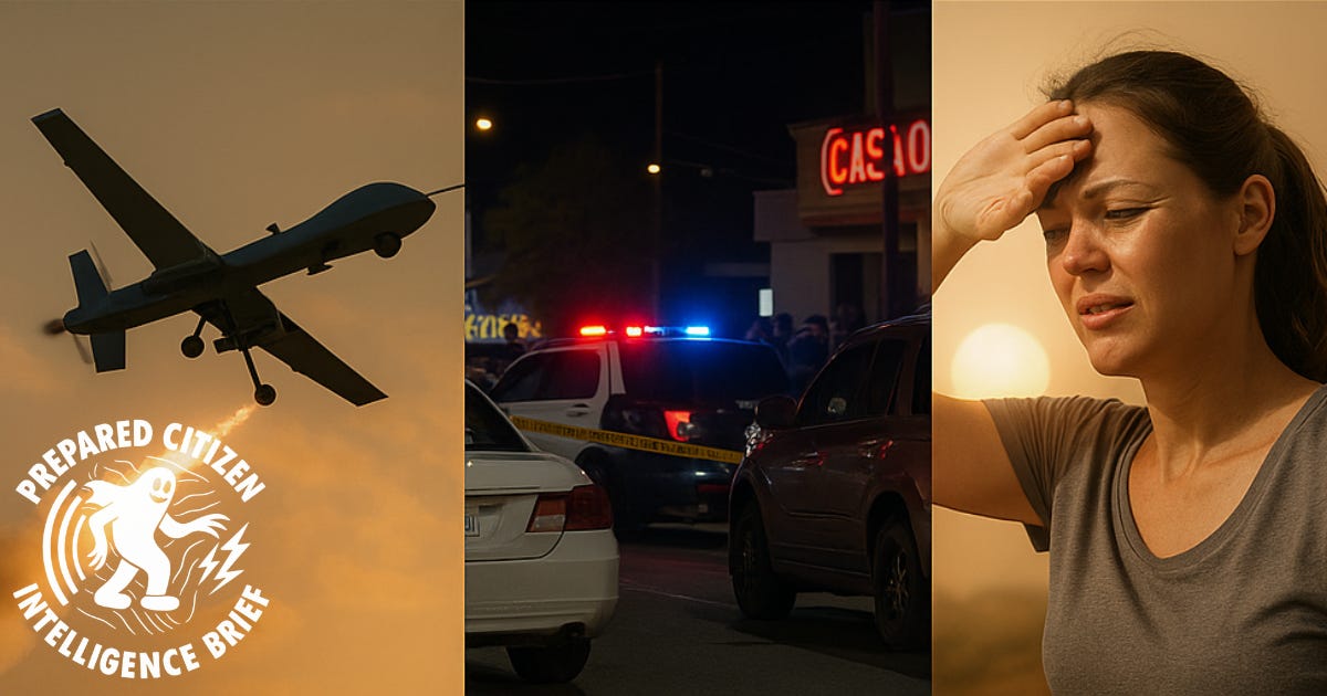 The last two days have been dominated by severe weather and high heat across the United States, which have stressed power systems and caused widespread outages. A violent attack in a Manhattan office tower and a separate shooting outside a Nevada casino highlight the continued threat of lone‐actor violence. Internationally, conflict flashpoints persist – a fragile ceasefire in Cambodia and Thailand is fraying, Somalia’s federal and regional forces have clashed again, and Ukraine’s long‑range drone campaign is hitting Russian rail hubs.