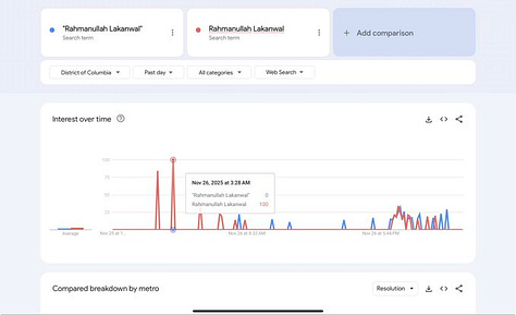 Searches for the name Rahmanullah Lakanwal potentially spiked in Washington, DC, hours before the shooting.